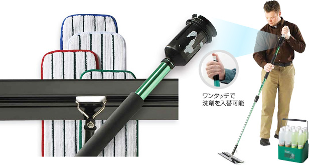 ハンドル1本で、モップとバケツの仕事を従来の約半分の時間でこなします。ハンドルの先端に洗剤を入れた特殊設計ボトルをセットして使います。モップをバケツに繰り返し浸す動作がないので、バケツ内の汚れた洗剤で清掃を続けることがありません。ハンドル先端の洗剤はワンタッチで取り外しができ、清掃エリアに最も適した洗剤に素早く入れ替えが可能です。洗剤ボトルは単独でも使用できるので、テーブルや洗面台の拭き上げなどにたいへん便利です。