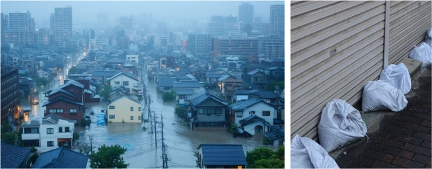 近年、局地的に突然激しく降り出す「ゲリラ豪雨」や、同じ場所に雨雲が次々と発生する「線状降水帯」による大雨が頻発し、各地で浸水被害が増えています。 浸水対策には従来より土嚢(どのう)が使われてきましたが、その重量から運搬や設置には多大な労力と時間を要し、女性や年配者には扱いが困難なものでした。 「もっとスピーディーに、誰もが確実に対応できる浸水対策用品はできないものだろうか?」 そんな思いから生まれたのが「Flood Guard F (フラッドガードF)」です。